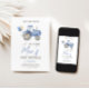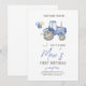 Esta invitación de cumpleaños incluye un lindo tractor azul con globos de colores que se esconden detrás, y el nombre aparece de manera prominente en letras grandes y alegres. ¡Todo se trata de diversión y emoción por la próxima fiesta de cumpleaños con tema de tractores en el campo!