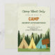 "Invitación de cumpleaños con tema de camping. La parte delantera presenta tiendas de campaña ilustradas y pinos, con el texto 'Sólo ambiente de campamento, ven a acampar, cumpleaños de Joseph número 10'. La parte trasera es de color verde sólido. El tono general es aventurero y al aire libre."