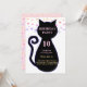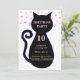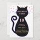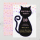 Invitación de cumpleaños con silueta de gato adorable y confeti multicolor sobre fondo blanco y rosa. Todos los textos y números están listos para ser personalizados.