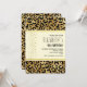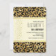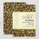 Una invitación de cumpleaños con un patrón elegante que presenta manchas de leopardo exóticas en negro sobre un fondo dorado. Un marco rectangular de color crema con un borde de lámina dorada falsa superpuesto con el texto de su fiesta dentro. Confeti dorado falso a lo largo del borde izquierdo.