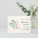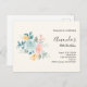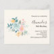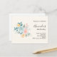 Invitación de cumpleaños con una bonita ilustración de acuarela. Un ramo de flores con flores rosas y azules rodeadas de hojas verdes y ramitas.