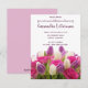 Esta invitación editable presenta un ramo de tulipanes y rosas rosadas, moradas y blancas. El texto en la parte frontal es editable, así que adelante, cambie los detalles, así como el color, estilo y tamaño de la fuente y hágalo suyo. Esta invitación se puede utilizar para cumpleaños, aniversarios, jubilaciones, compromisos, etc.