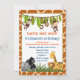 Una invitación de cumpleaños con un tema de safari genial. El fondo es un patrón de piel de jirafa. Diseñado con un banner de hojas de selva en la parte superior y monos traviesos colgando boca abajo. Un hipopótamo, gorila, león y jirafa pasando el rato en la parte inferior entre algunas hierbas de la sabana. Personaliza con los detalles de tu fiesta.