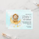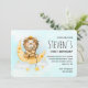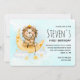 Invitación de cumpleaños con una ilustración de acuarela adorable. Un león adorable que lleva una corona pescando estrellas sentado en una luna creciente descansando en una nube esponjosa. Ilustración de fantasía mágica. La parte inferior tiene un borde de pequeñas estrellas doradas. Fondo de acuarela azul claro.