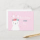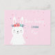 Una tarjeta de invitación de cumpleaños con un lindo conejo blanco con corona de flores en la cabeza.