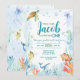 Crea la invitación perfecta para baby shower con un adorable diseño bajo el mar de acuarela con animales del océano pintados a mano, incluyendo una ballena, coral, pulpo, tortugas, peces y más. La parte trasera de la tarjeta es tan hermosa como la delantera, con todos los animales en su hábitat de acuarela.