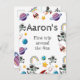 Invitaciones de cumpleaños de primer año de espacio exterior con un fondo de cielo estrellado, planetas del sistema solar esparcidos alrededor del borde, una nave espacial, astronauta y una plantilla de celebración de cumpleaños número 1 moderna y fácil de personalizar.