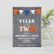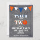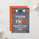 Divertida invitación de cumpleaños de baloncesto en pizarra para niños de 2 años // Tarjeta de cumpleaños de baloncesto adorable para el segundo cumpleaños. El diseño tiene un gran baloncesto y banderas de banderines en colores naranja y blanco sobre fondo de pizarra. La parte trasera tiene un patrón de rayas sobre fondo naranja. Personaliza esta invitación de cumpleaños con el nombre y una foto del niño y personaliza todos los datos de la invitación. Ideal como invitación para la fiesta de cumpleaños de niños de 2 años.