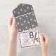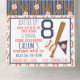 Una invitación de cumpleaños con tema de béisbol con impresiones de béisbol estilo vintage en un esquema de colores rojo, azul y blanco. ¡Celebre el gran día de su pequeño slugger con esta invitación de fiesta de béisbol personalizada todo en uno!