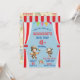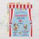 Circo temática cualquier invitación de cumpleaños de edad, invitación perfecta para invitar a sus invitados a su gran fiesta de cumpleaños. El frente cuenta con una gran carpa superior con pancarta de aferramiento, timbre de anillo, que representa elefantes y bandera de circo. La parte trasera de la invitación tiene huellas de circo, elefantes, payasos y sello interpretativo. Edite todo el texto usted mismo cuando lo solicite.