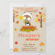 Invitación de cumpleaños de búho Invitación de búho chica de otoño dulce. Invite a sus amigos con esta alegre y colorida invitación temática de Otoño! Esta invitación roja, naranja, marrón y verde del otoño incluye un lindo búho con girasol, varios árboles y algunas hojas alrededor. Simplemente edite esta plantilla fácil de usar en el menú Personalización para hacerlo especial.