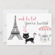 Invitación personalizada a la fiesta de cumpleaños de un gato parisino. Esta invitación incluye un gatito adorable en París con la torre Eiffel y una mesa de café.