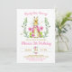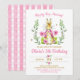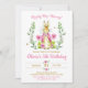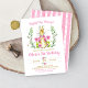 La invitación de cumpleaños de niña de Pascua presenta un conejo lindo con hojas de eucalipto y flores rosadas. Este diseño es ideal para alguien que tenga una fiesta de cumpleaños con tema de conejo.