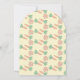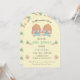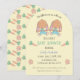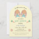 Una dulce invitación de baby shower con arco amarillo claro con dos pequeños conejos marrones gemelos en la parte frontal. Personalízala con tu información utilizando los campos del template. En la parte trasera, tienes un patrón hecho de zanahorias y pequeñas flores naranjas. Perfecto para Pascua o primavera.