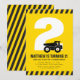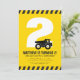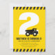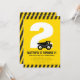¡La emoción está aumentando! ¡Prepárate para una celebración de construcción! Esta invitación de cumpleaños infantil con tema de constructor negro y amarillo presenta un camión de volteo frente a la edad del niño. La edad y el color de fondo se pueden personalizar.