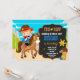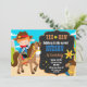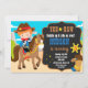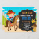 Invitación de cumpleaños de Cowboy Invitación de Cowboy para niño Invitación de cumpleaños occidental. Invite a sus amigos con esta alegre y colorida invitación occidental. Esta invitación temática de País Marrón y Azul muestra a un niño montando un caballo, una placa de sheriff y botas de vaquero. Simplemente edite esta plantilla fácil de usar en el menú Personalización para hacerlo especial.