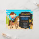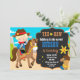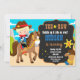 Invitación de cumpleaños de Cowboy Invitación de Cowboy para niño Invitación de cumpleaños occidental. Invite a sus amigos con esta alegre y colorida invitación occidental. Esta invitación temática de País Marrón y Azul muestra a un niño montando un caballo, una placa de sheriff y botas de vaquero. Simplemente edite esta plantilla fácil de usar en el menú Personalización para hacerlo especial.