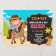 Invitación de cumpleaños de niña de vaca Invitación de niña de chica para la invitación de cumpleaños occidental. Invite a sus amigos con esta alegre y colorida invitación occidental. Esta invitación temática a los países de color marrón y rosa incluye a un chica montando una placa de alguacil y botas de vaquero. Simplemente edite esta plantilla fácil de usar en el menú Personalización para hacerlo especial.