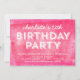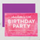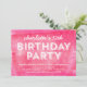 Invitación moderna para fiesta de cumpleaños que incluye las palabras "Fiesta de cumpleaños" en blanco sobre un fondo con patrón de tinta rosada enrollada, perfecto para cualquier edad. La invitación de cumpleaños incluye un reverso morado. Echa un vistazo a otras invitaciones de cumpleaños aquí https://www.zazzle.com/collections/childrens_birthday_invitation-119229052564655496?rf=238364477188679314 y aquí https://www.zazzle.com/collections/birthday_invitations_for_adults-119400127857134028?rf=238364477188679314