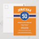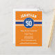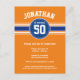 Rayas azules reales y un fondo naranja destacan esta invitación de cumpleaños con tema deportivo. El diseño incluye un diseño de camiseta deportiva con un área para resaltar el nombre y la edad del cumpleañero.