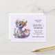 Tarjeta postal de invitación de cumpleaños con una ilustración de un dragón mítico. Escamas moradas y azules. Una corona de oro floreada con cuernos adorna su cabeza. Mágico, divertido y amigable.