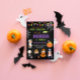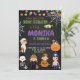 Invitación de cumpleaños de fiesta de disfraces de Halloween Invitación a Cutest para celebrar su cumpleaños de Halloween. Invite a la gente a su fiesta con este diseño increíble. El gato lindo que sale de la calabaza con pancarta de halloween, lunas y murciélagos es una gran combinación para los niños cumpleaños!
