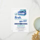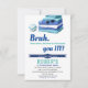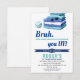 Invitación de cumpleaños de fiesta de piscina azul divertida para niños. El diseño presenta un fondo blanco simple con el título "BRUH".