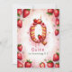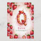 Celebra un cumpleaños especial con esta deliciosa carta de fresa "Q", ¡invitación para pasteles! Este encantador diseño acuático cuenta con una tarta divertida y festiva en forma de "Q", decorada con fresas frescas, glaseado rosa y una vela de cumpleaños brillante. El suave fondo rosa con fresas dispersas aporta un toque divertido. Personalice con el nombre, edad y detalles del fiesta de su hijo para una celebración de cumpleaños con temática de fresa única. Perfecto para los más pequeños que aman a los fiestas de la fruta o los cumpleaños del verano.
