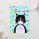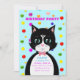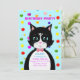 Tarjeta de invitación de cumpleaños con un lindo gato esmoquin como mensajero y bolas multicolores sobre fondo turquesa. Todo el texto listo para ser personalizado.