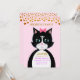 Tarjeta de invitación a fiesta de cumpleaños con un lindo gato de esmoquin como mensajero con confeti dorado como encabezado sobre fondo rosa. Todo el texto listo para ser personalizado.