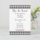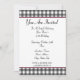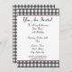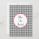 Una simple invitación con un diseño de gingham gris carbón en la parte superior e inferior del frente. Recorte rosa y fuente en negrita de cinta negra. Personalice con los detalles de su ocasión. El lado opuesto presenta un diseño sólido con una forma circular en el medio, enmarcando el texto.