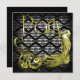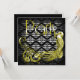 Este bonito y elegante diseño, llamado Golden Peacock Art Deco Birthday Invitation, tiene un hermoso fondo de damasco negro y gris. En la parte superior en letras doradas dice Fiesta con un ilustracion de pavo real en el lado derecho. En la parte trasera está el texto del personalizable para una fiesta de cumpleaños o cualquier otro evento.