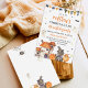 La invitación incluye fantasmas lindos, murciélagos, una calabaza y un gato con pancartas y estrellas en el fondo. Este diseño es perfecto para una fiesta de cumpleaños temática de Halloween.
