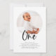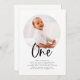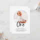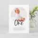 Una invitación moderna de cumpleaños con una foto redonda y la palabra 'Uno' con un tipo de letra caligráfica, ¡perfecta para el primer fiesta de cumpleaños de tu pequeño!