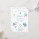 Elegante invitación de cumpleaños para niños en tonos azules y dorados con un tema de delfines dulces, estrellas de mar y medusas, así como burbujas de agua. Fondo blanco. Patrón de burbuja azul en el lado posterior.