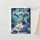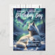 ¡Cumpleañero! Invita a amigos y familiares a tu fiesta de cumpleaños con esta sencilla imagen de dos lobos blancos sentados con gracia en la nieve brillante bajo una impresionante aurora boreal, su pelaje se mezcla perfectamente con el paisaje invernal.