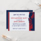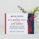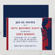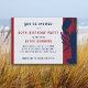 Invitación de cumpleaños roja, blanca y azul con diseño de langostino. Fuentes impresas masculinas con letras desgastadas y texto rojo y azul. El fondo es muy gris claro, con gráfico rojo detrás del langostino en el borde de las tarjetas horizontales. La parte posterior es azul sólido.