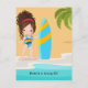 Invitación de cumpleaños de niña para fiesta de verano en la playa con una linda chica morena surfista personalizable a tus especificaciones.