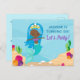 Únete a nosotros bajo el mar para una fiesta de cumpleaños infantil caprichosa para una niña afroamericana que ama a las sirenas de cabello púrpura. Estas divertidas tarjetas de invitación para fiestas infantiles presentan una adorable sirena negra de cabello azul nadando alrededor del hermoso coral del océano. Un tema fresco para una fiesta de piscina infantil con agua azul profunda.