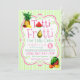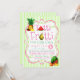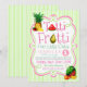 Invitación de cumpleaños de niñas Tutti Frutti con sandía, piña, naranjas, plátanos, fresas y una pera sobre un fondo de lunares rosados y rayas verdes. Puedes personalizar fácilmente esta adorable invitación de cumpleaños Tutti Frutti para tu evento simplemente agregando tus detalles.