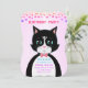 Tarjeta de invitación de cumpleaños con un adorable gato esmoquin como mensajero y bolas multicolores como encabezado sobre fondo degradado rosa. Todo el texto listo para ser personalizado.