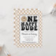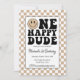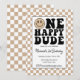Invitación de cumpleaños del primer año de One Happy Dude. Fondo a cuadros color beige y acentos negros