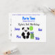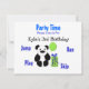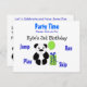 Un lindo oso panda sostiene un globo verde y un regalo verde con una reverencia azul a su lado. Divertidas palabras fiestas, personalizares como se desee.