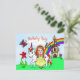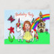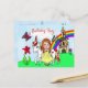 Una bonita princesa de dibujos animados de estilo arte popular rojo dibujado a mano y un unicornio con castillo, flores y mariposa en el fondo. Una forma bonita pero asequible de repartir muchas invitaciones de cumpleaños divertidas de cuento de hadas.