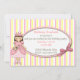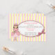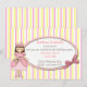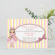 Invitación de cumpleaños de princesa para niña, realizada con un fondo a rayas blancas, rosadas y amarillas. Un área de texto ovalada se encuentra encima, con gráficos de un lazo rosa, en el lado derecho y gráficos primitivos campestres de una niña princesa, en el lado izquierdo. Personalice el texto para la fiesta de cumpleaños de su hijo. Su hija se sentirá como una verdadera princesa, con estas dulces invitaciones para su fiesta. Productos coincidentes disponibles.