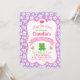 Esta es una invitación de cumpleaños de rana princesa adorable con un fondo morado florido.