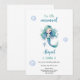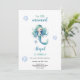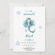 Una invitación de cumpleaños de sirena azul color agua. Fantástica y divertida bajo el tema del mar. carta de presentación de la invitación de cumpleaños con una cola de sirena color arcoiris con escalas falsas de purpurina oro. El texto de arriba dice "Nuestra sirenita". Tema fiesta divertido para el cumpleaños de un chica.