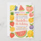 ¡Sube las vibraciones tropicales con esta invitación de cumpleaños divertida y fructífera! Con ilustraciones lúdicos de sandía, piña y cítricos con toques de color tropical, esta invitación es perfecta para fiestas en la piscina, cumpleaños de verano o celebraciones con temas de luau. ¡personalizable total para igualar tu evento y dar vida a la diversión de verano!