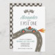 Fast One Race Car Invitación de primer cumpleaños con auto de carrera retro azul.