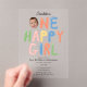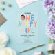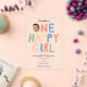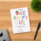 Un hermoso diseño de invitación de cumpleaños con una foto de cara dibujada a mano. Una linda invitación de cumpleaños de "Una niña feliz" para una fiesta de cumpleaños número uno. Un hermoso tema de invitación de cumpleaños de verano que se puede personalizar con tus detalles.